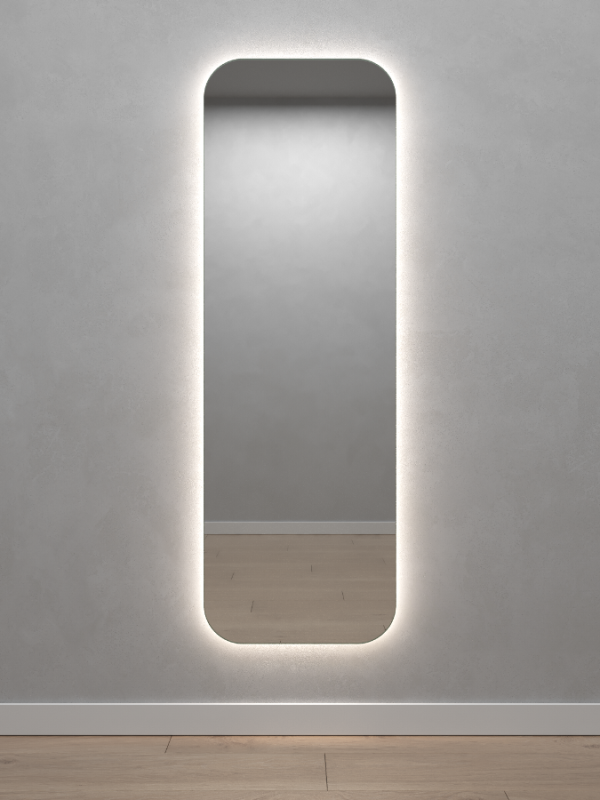 Безрамное зеркало прямоугольной формы с контурной (тыльной) нейтральной подсветкой, свет 4000К. Подложка из высококачественного МДФ, светодиодная лента защищена матовым свето-рассеивателем от попадания пыли и влаги. Есть вывод 220W для подключения к сети, включение подсветки от выключателя на стене, либо от розетки.
